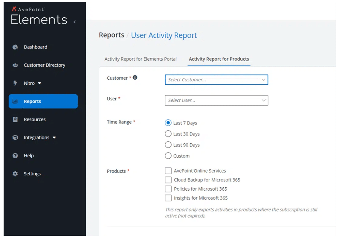 Elements bietet jetzt Audit-Funktionen, die nicht nur die Aktivitäten von Nutzeraktionen innerhalb von Elements selbst verfolgen, sondern jetzt auch die Aktivitäten Ihrer Nutzer innerhalb bestimmter AvePoint-Produkte verfolgen. Mit den neuen Audit-Funktionen können Sie einen einzigen Bericht erstellen, der alle Aktionen zusammenfasst, die von ausgewählten Elements-Nutzern in der Cloud Backup for Microsoft 365-, AvePoint Online Services- und Policies and Insights-Umgebung Ihres Kunden innerhalb eines bestimmten Zeitraums durchgeführt wurden.