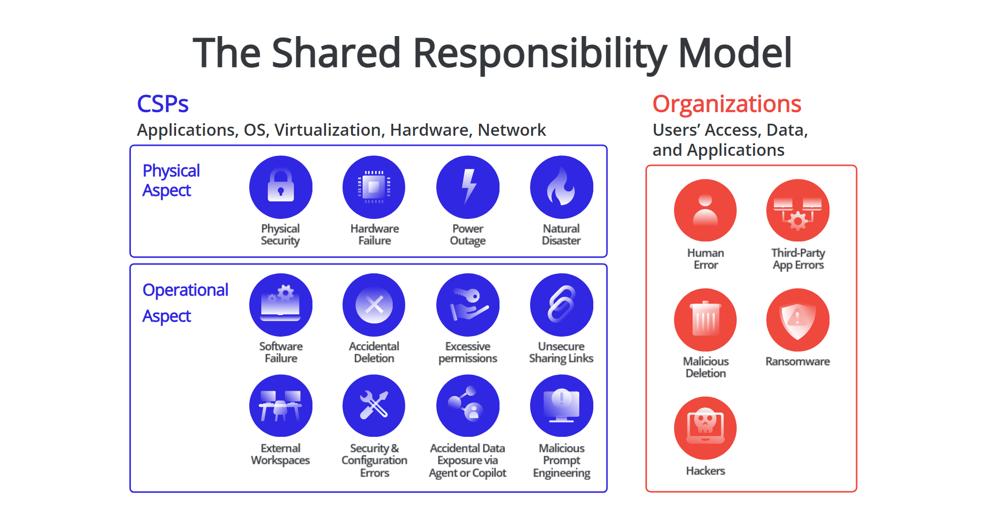 CSPs are responsible for securing their infrastructure, but customers are equally responsible for protecting their data and digital environment. This includes addressing risks like human errors, accidental or malicious deletions, ransomware, third-party application errors, and other cyber threats. While CSPs secure the cloud infrastructure, customers must secure their data, systems, applications, and user access and permissions within the cloud.